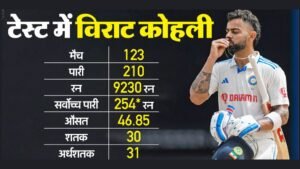 कोहली ने 123 टेस्ट मैचों में 9230 रन बनाए, जिसमें 30 शतक और 31 अर्धशतक शामिल हैं।
